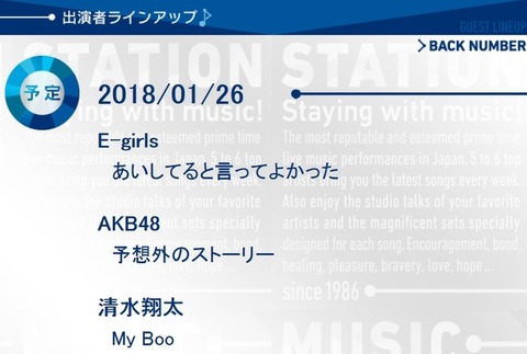 2018-01-26 17:10:00 ぱるる情報局 本日のMステは岡田・柏木・白間・高柳・田野・峯岸・山本・横山の8人! 指原・松井珠・宮脇らは出演せず【ボーカル選抜】 [詳細] |