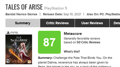 2021-09-09 07:33:00 ゲーハーKING速報 PS5『テイルズオブアライズ』海外レビュー「JRPGの中で最も優れている」「最高のテイルズゲーム」大絶賛評価でメタスコアは87点!! [詳細] |