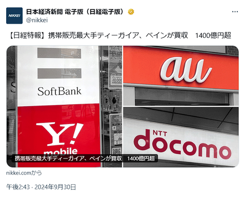 2024-09-30 20:28:00 市況かぶ全力2階建 携帯ショップ代理店のティーガイア、ベインキャピタルによるディスカウントTOBなのに場中リーク記事をよく読まずにスッ高値で飛びつく被害が多数発生 [詳細] |