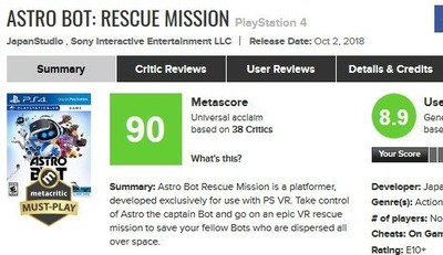 2018-10-14 08:48:00 ゲーハーKING速報 SIEのPSVR新作『ASTRO BOT』高評価相次ぎメタスコアは90点に上昇!!VR専門家「別次元の注目を集めている」 [詳細] |