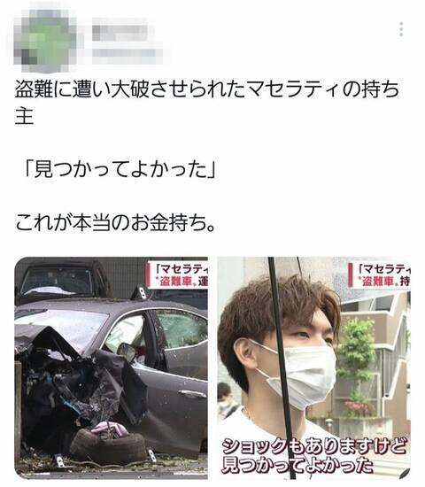 2022-06-17 12:08:00 サイ速 【悲報】同情から一転…マセラティを盗まれ事故で破壊されたオーナーさん、どうやって稼いで買ったのか判明しネットが騒然となる [詳細] |