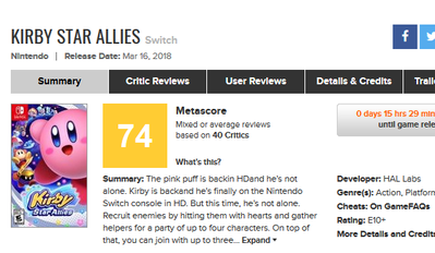 2018-03-15 08:33:00 ゲーハーKING速報 スイッチ『星のカービィ スターアライズ』海外レビュー「底が浅い退屈なゲーム」「腹立たしいロード時間」メタスコアは74点・・ [詳細] |