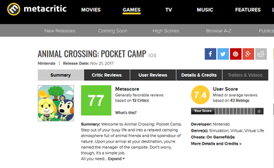 2017-11-26 19:25:00 ゲーハーKING速報 IGNジャパン「どうぶつの森ポケットキャンプはスローライフを労働に変えたことでショックを受ける可能性が高い」海外メタスコアは77点と微妙な結果に・・ [詳細] |