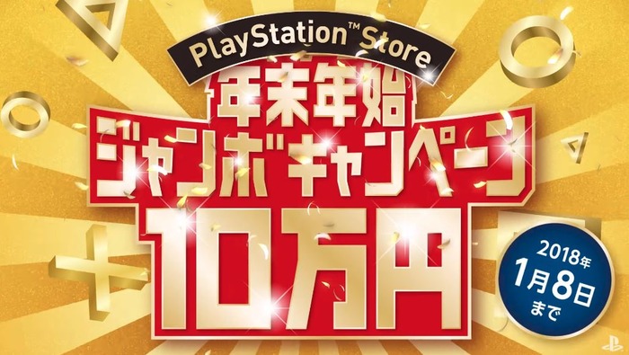 2017-12-14 17:35:00 PS4速報! PS Store『年末年始ジャンボキャンペーン』が本日よりスタート!10万円分のPSチケットが貰えるキャンペーンや最大95%オフのセールも! [詳細] |