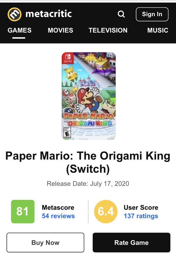 2020-07-19 22:00:00 Y速報 【悲報】『ペーパーマリオ オリガミキング』メタスコア81・ユーザースコア6.4と不評。なぜ前のシステムに戻さないのか・・・ [詳細] |