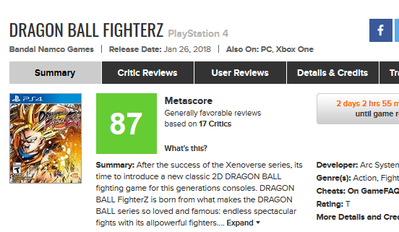 2018-01-23 21:13:00 ゲーハーKING速報 『ドラゴンボールファイターズ』海外レビュー「DBファンの夢が叶った」「今の時代における最高の格闘ゲーム」メタスコアは87点の絶賛評価に!! [詳細] |