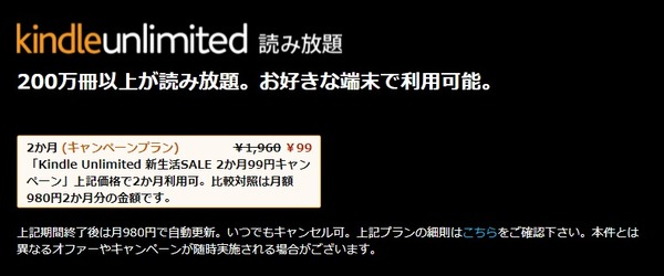 2022-03-20 23:35:00 Y速報 【3/29まで】『Kindle Unlimited』新規以外も対象!!2ヶ月99円キャンペーン開催キタ――(゚∀゚)――!! [詳細] |