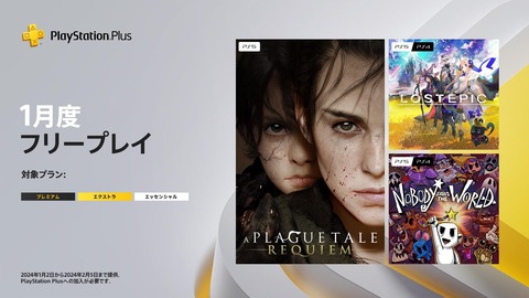 2023-12-28 21:23:00 ゲーム感想・評価まとめ@2ch 1月のPSプラス、フリープレイに『プレイグ テイル -レクイエム-』『LOST EPIC』『Nobody Saves the World』が登場! [詳細] |