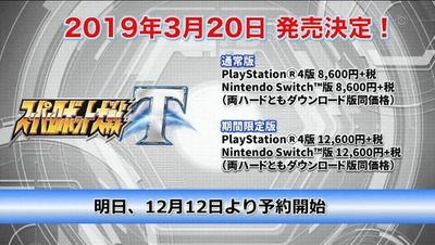 2018-12-11 23:32:00 ゲーハーKING速報 PS4/スイッチ『スーパーロボット大戦T』発売日が3月20日に決定!!全35曲を収録した限定版「プレミアムアニメソング&サウンドエディション」も発売 [詳細] |