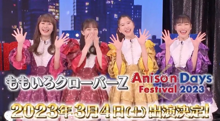 2022-12-17 14:01:00 ももクロ侍 【告知動画】ももクロ、3月開催『AnisonDays Festival 2023』出演決定!ファンクラブ先行受付スタート! [詳細] |