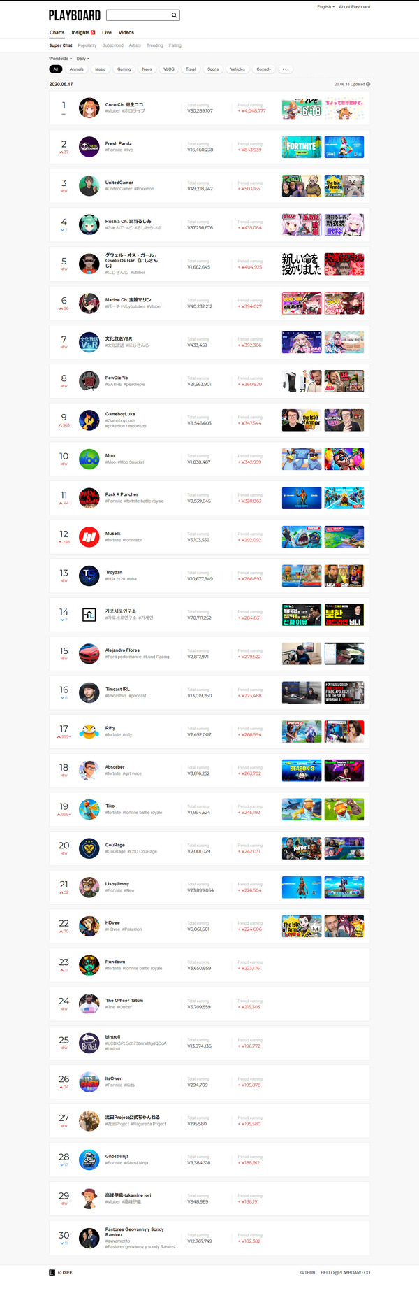 2020-06-24 01:00:00 Y速報 【ドリーム】YouTubeやはりゲーム実況者たちの天下だった。投げ銭収益額ランキング全世界上位のほとんどがゲーム実況系 [詳細] |