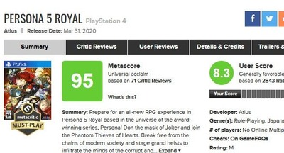 2021-01-10 20:22:00 ゲーハーKING速報 レビュー集積サイトMetacritic、2020年の最高スコアは『ペルソナ5 ザ・ロイヤル』の95点!!GOTY獲得したラスアス2とツシマは鏡合わせの評価に [詳細] |