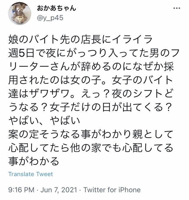 2021-12-25 23:34:00 鬼女の井戸端会議-鬼女、キチママ、修羅場、生活まとめ- 夜時間バイトに入ってた男性が辞めた。店長が次のバイトに女性を採用した。すると他の女バイトやその保護者がざわつき出して… [詳細] |