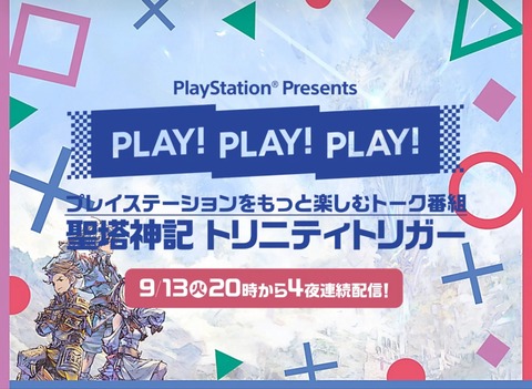 2022-09-13 01:00:00 ゲーム感想・評価まとめ@2ch SIE、「PLAY! PLAY! PLAY! 」を明日から4夜連続放送!『聖塔神記 トリニティトリガー』を紹介 [詳細] |