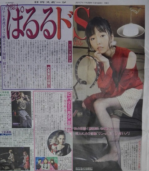 2017-12-27 08:50:00 ぱるる情報局 【島崎遥香-リピート】ぱるる「新ドラマのドS役、以前縁を切った女友達をイメージしてる。すごく束縛が強かったので」 [詳細] |