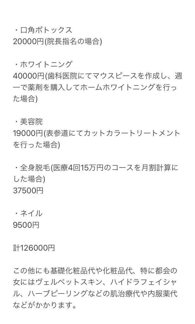 2022-01-02 20:34:00 鬼女の井戸端会議-鬼女、キチママ、修羅場、生活まとめ- 男性が「普通の女の子が好き」とよく言う。「髪が綺麗、歯が綺麗、肌が綺麗、あとネイル」と。なのでそれを維持するためのひと月の金額の見積もりを出してやりました… [詳細] |