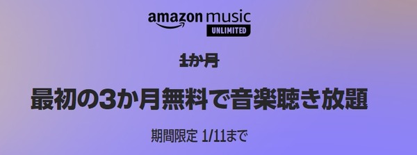 2022-12-23 01:38:00 Y速報 【1/11まで】『Amazon Music Unlimited』3か月無料で音楽聴き放題キャンペーン開催中!! [詳細] |