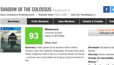 2018-01-31 08:12:00 ゲーハーKING速報 【神ゲー】PS4リメイク版『ワンダと巨像』海外レビュー「リメイクのお手本」「並外れた傑作」大絶賛評価でメタスコアはなんと驚異の93点!! [詳細] |