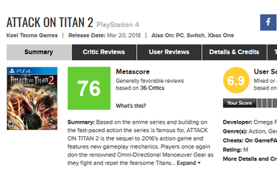 2018-03-23 07:43:00 ゲーハーKING速報 『進撃の巨人2』海外レビュー「オメガフォースでも胸を張れる驚くほど優れたゲーム」「無双スピンオフ最高傑作」「単なる焼き直し」メタスコア評価は76点・・ [詳細] |