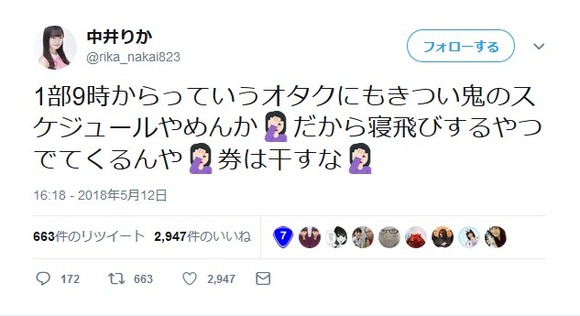 2018-05-13 14:32:00 AKB48タイムズ(AKB48まとめ) 【NGT48】中井りか「1部9時からっていうオタクにもきつい鬼のスケジュールやめんか だから寝飛びするやつでてくるんや」【りか姫】 [詳細] |
