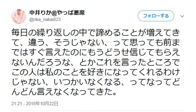 2018-10-24 16:14:00 AKB48タイムズ(AKB48まとめ) NGT48・中井りか「私が何かを発信したところでなにも変わらない」「自業自得といえばそうとしか言えない」「私も人間不信だから」【りか姫】 [詳細] |