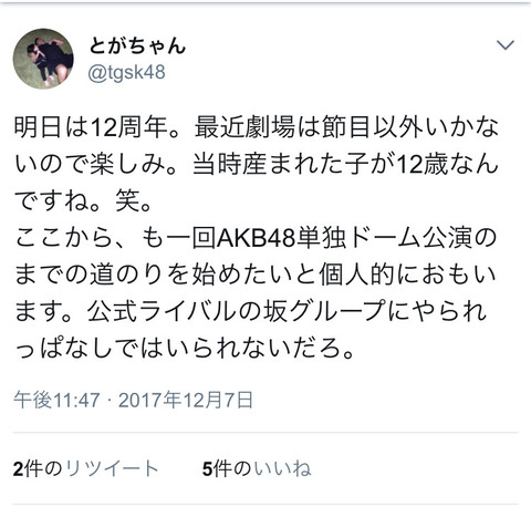 2017-12-08 14:03:00 地下帝国-AKB48まとめ 【朗報】戸賀崎「もう一回AKB48単独ドーム公演のまでの道のりを始めたい。坂グループにやられっぱなしではいられないだろ」 [詳細] |