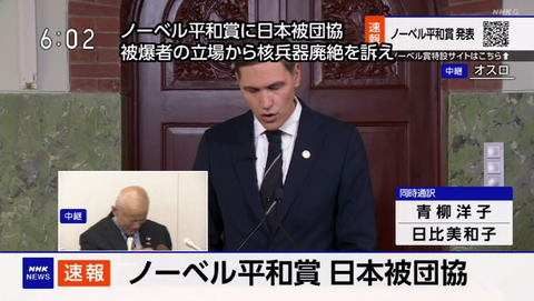 2024-10-11 19:50:00 市況かぶ全力2階建 日本原水爆被害者団体協議会(被団協)にノーベル平和賞、共産党系の原水爆禁止日本協議会(原水協)と旧社会党系の原水爆禁止日本国民会議(原水禁)は無関係なのでデマや思い込みに注意 [詳細] |