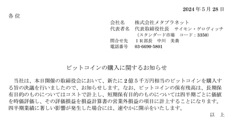 2024-07-09 02:44:00 市況かぶ全力2階建 本業としてビットコイン1点賭けを始めたメタプラネット、引くに引けず含み損上等でビットコインのナンピン買いを実行 [詳細] |